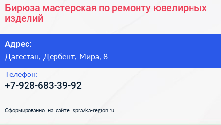 Бирюза, мастерская по ремонту ювелирных изделий по адресу Дагестан, Дербент, Мира, 8 в дальнейшем Организация, размещена в следующих категориях: