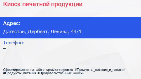 Киоск печатной продукции по адресу Дагестан, Дербент, Ленина, 44/1 в дальнейшем Организация, размещена в следующих категориях: