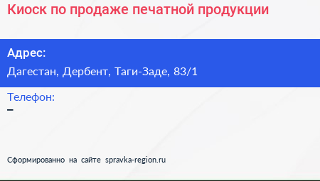 Киоск по продаже печатной продукции по адресу Дагестан, Дербент, Таги-Заде, 83/1 в дальнейшем Организация, размещена в следующих категориях: