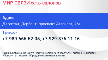 МИР СВЯЗИ, сеть салонов по адресу Дагестан, Дербент, проспект Агасиева, 26а в дальнейшем Организация, размещена в следующих категориях: