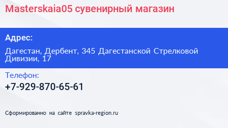 Masterskaia05, сувенирный магазин по адресу Дагестан, Дербент, 345 Дагестанской Стрелковой Дивизии, 17 в дальнейшем Организация, размещена в следующих категориях: