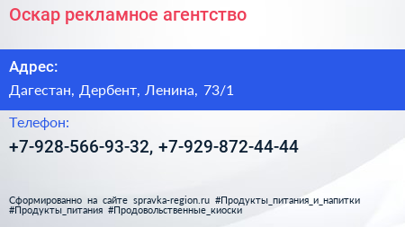 Оскар, рекламное агентство по адресу Дагестан, Дербент, Ленина, 73/1 в дальнейшем Организация, размещена в следующих категориях: