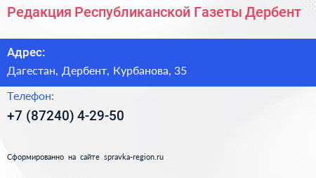 Редакция Республиканской Газеты Дербент по адресу Дагестан, Дербент, Курбанова, 35 в дальнейшем Организация, размещена в следующих категориях: