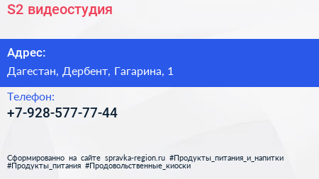 S2, видеостудия по адресу Дагестан, Дербент, Гагарина, 1 в дальнейшем Организация, размещена в следующих категориях: