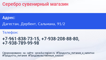 Серебро, сувенирный магазин по адресу Дагестан, Дербент, Сальмана, 91/2 в дальнейшем Организация, размещена в следующих категориях: