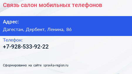 Связь, салон мобильных телефонов по адресу Дагестан, Дербент, Ленина, 86 в дальнейшем Организация, размещена в следующих категориях: