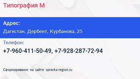 Типография-М по адресу Дагестан, Дербент, Курбанова, 25 в дальнейшем Организация, размещена в следующих категориях: