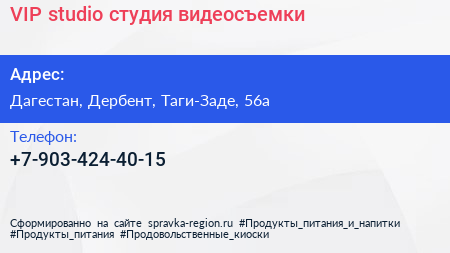 VIP studio, студия видеосъемки по адресу Дагестан, Дербент, Таги-Заде, 56а в дальнейшем Организация, размещена в следующих категориях:
