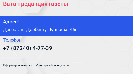 Ватан, редакция газеты по адресу Дагестан, Дербент, Пушкина, 46г в дальнейшем Организация, размещена в следующих категориях: