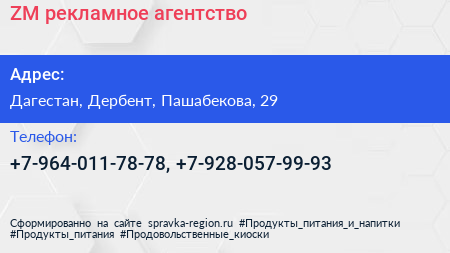 ZM, рекламное агентство по адресу Дагестан, Дербент, Пашабекова, 29 в дальнейшем Организация, размещена в следующих категориях: