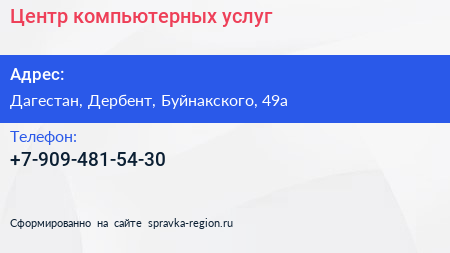 Центр компьютерных услуг по адресу Дагестан, Дербент, Буйнакского, 49а в дальнейшем Организация, размещена в следующих категориях: