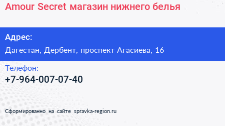 Amour Secret, магазин нижнего белья по адресу Дагестан, Дербент, проспект Агасиева, 16 в дальнейшем Организация, размещена в следующих категориях: