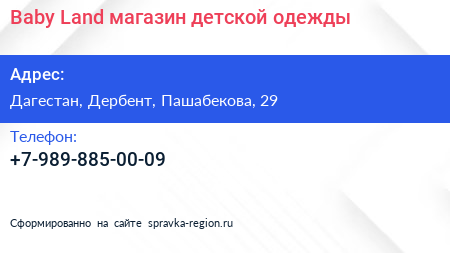 Baby Land, магазин детской одежды по адресу Дагестан, Дербент, Пашабекова, 29 в дальнейшем Организация, размещена в следующих категориях: