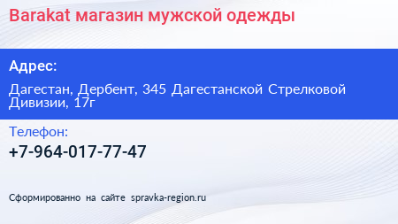 Barakat, магазин мужской одежды по адресу Дагестан, Дербент, 345 Дагестанской Стрелковой Дивизии, 17г в дальнейшем Организация, размещена в следующих категориях: