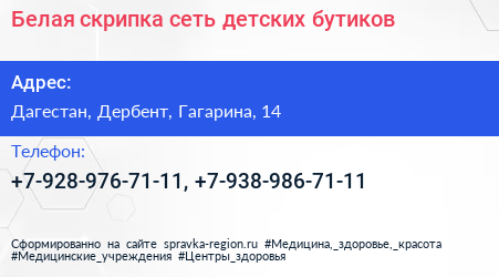 Белая скрипка, сеть детских бутиков по адресу Дагестан, Дербент, Гагарина, 14 в дальнейшем Организация, размещена в следующих категориях: