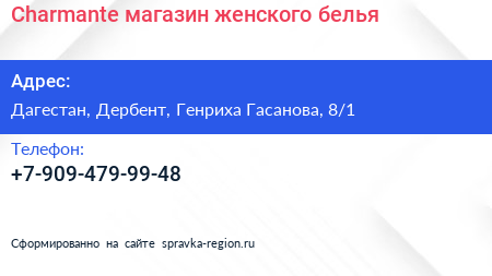 Charmante, магазин женского белья по адресу Дагестан, Дербент, Генриха Гасанова, 8/1 в дальнейшем Организация, размещена в следующих категориях: