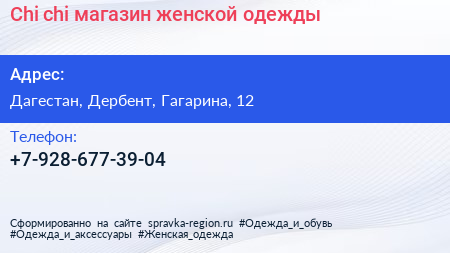 Chi chi, магазин женской одежды по адресу Дагестан, Дербент, Гагарина, 12 в дальнейшем Организация, размещена в следующих категориях: