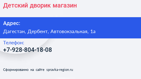 Детский дворик, магазин по адресу Дагестан, Дербент, Автовокзальная, 1а в дальнейшем Организация, размещена в следующих категориях: