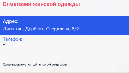 Di, магазин женской одежды по адресу Дагестан, Дербент, Свердлова, 8/2 в дальнейшем Организация, размещена в следующих категориях: