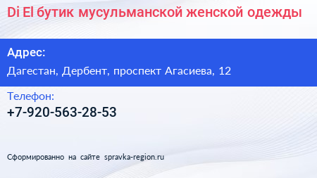 Di.El, бутик мусульманской женской одежды по адресу Дагестан, Дербент, проспект Агасиева, 12 в дальнейшем Организация, размещена в следующих категориях: