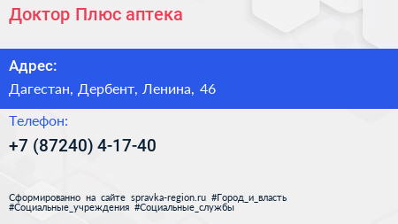 Доктор Плюс, аптека по адресу Дагестан, Дербент, Ленина, 46 в дальнейшем Организация, размещена в следующих категориях: