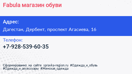 Fabula, магазин обуви по адресу Дагестан, Дербент, проспект Агасиева, 16 в дальнейшем Организация, размещена в следующих категориях: