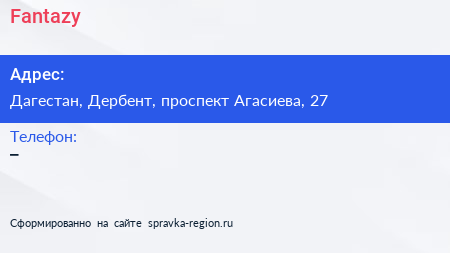 Fantazy по адресу Дагестан, Дербент, проспект Агасиева, 27 в дальнейшем Организация, размещена в следующих категориях: