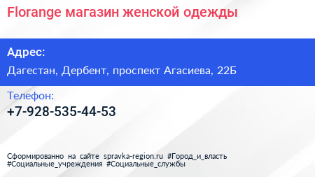 Florange, магазин женской одежды по адресу Дагестан, Дербент, проспект Агасиева, 22Б в дальнейшем Организация, размещена в следующих категориях: