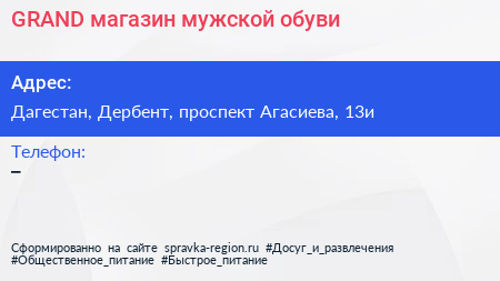 GRAND, магазин мужской обуви по адресу Дагестан, Дербент, проспект Агасиева, 13и в дальнейшем Организация, размещена в следующих категориях: