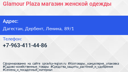 Glamour Plaza, магазин женской одежды по адресу Дагестан, Дербент, Ленина, 89/1 в дальнейшем Организация, размещена в следующих категориях: