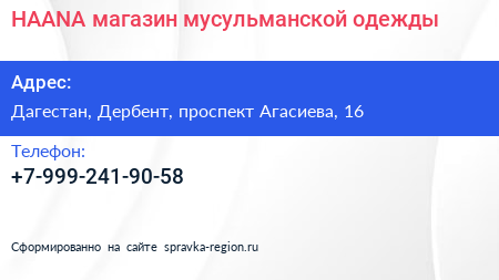 HAANA, магазин мусульманской одежды по адресу Дагестан, Дербент, проспект Агасиева, 16 в дальнейшем Организация, размещена в следующих категориях: