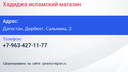 Хадиджа, исламский магазин по адресу Дагестан, Дербент, Сальмана, 2 в дальнейшем Организация, размещена в следующих категориях: