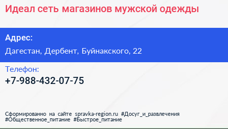 Идеал, сеть магазинов мужской одежды по адресу Дагестан, Дербент, Буйнакского, 22 в дальнейшем Организация, размещена в следующих категориях: