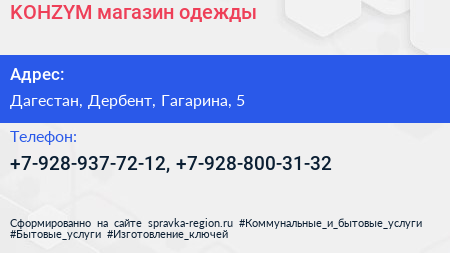 KOHZYM, магазин одежды по адресу Дагестан, Дербент, Гагарина, 5 в дальнейшем Организация, размещена в следующих категориях: