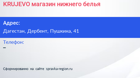 KRUJEVO, магазин нижнего белья по адресу Дагестан, Дербент, Пушкина, 41 в дальнейшем Организация, размещена в следующих категориях: