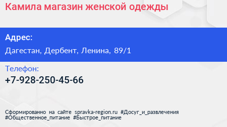 Камила, магазин женской одежды по адресу Дагестан, Дербент, Ленина, 89/1 в дальнейшем Организация, размещена в следующих категориях: