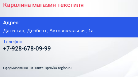 Каролина, магазин текстиля по адресу Дагестан, Дербент, Автовокзальная, 1а в дальнейшем Организация, размещена в следующих категориях: