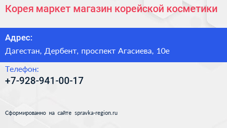 Корея маркет, магазин корейской косметики по адресу Дагестан, Дербент, проспект Агасиева, 10е в дальнейшем Организация, размещена в следующих категориях: