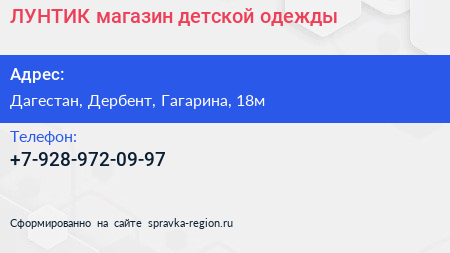 ЛУНТИК, магазин детской одежды по адресу Дагестан, Дербент, Гагарина, 18м в дальнейшем Организация, размещена в следующих категориях: