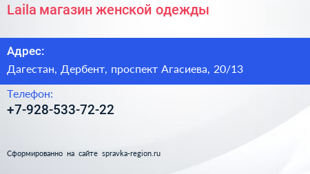 Laila, магазин женской одежды по адресу Дагестан, Дербент, проспект Агасиева, 20/13 в дальнейшем Организация, размещена в следующих категориях: