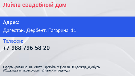 Лэйла, свадебный дом по адресу Дагестан, Дербент, Гагарина, 11 в дальнейшем Организация, размещена в следующих категориях: