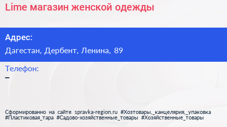 Lime, магазин женской одежды по адресу Дагестан, Дербент, Ленина, 89 в дальнейшем Организация, размещена в следующих категориях: