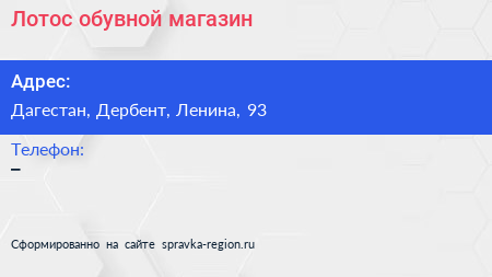 Лотос, обувной магазин по адресу Дагестан, Дербент, Ленина, 93 в дальнейшем Организация, размещена в следующих категориях: