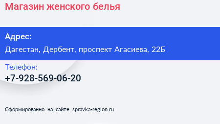 Магазин женского белья по адресу Дагестан, Дербент, проспект Агасиева, 22Б в дальнейшем Организация, размещена в следующих категориях:
