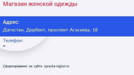 Магазин женской одежды по адресу Дагестан, Дербент, проспект Агасиева, 18 в дальнейшем Организация, размещена в следующих категориях: