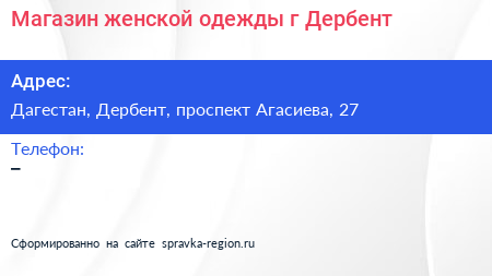 Магазин женской одежды, г. Дербент по адресу Дагестан, Дербент, проспект Агасиева, 27 в дальнейшем Организация, размещена в следующих категориях: