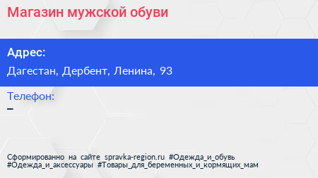 Магазин мужской обуви по адресу Дагестан, Дербент, Ленина, 93 в дальнейшем Организация, размещена в следующих категориях: