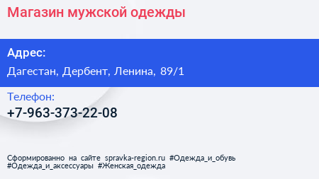 Магазин мужской одежды по адресу Дагестан, Дербент, Ленина, 89/1 в дальнейшем Организация, размещена в следующих категориях: