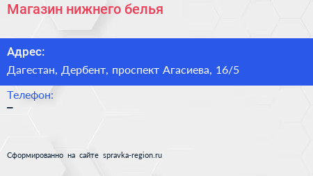 Магазин нижнего белья по адресу Дагестан, Дербент, проспект Агасиева, 16/5 в дальнейшем Организация, размещена в следующих категориях: