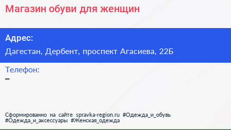 Магазин обуви для женщин по адресу Дагестан, Дербент, проспект Агасиева, 22Б в дальнейшем Организация, размещена в следующих категориях: